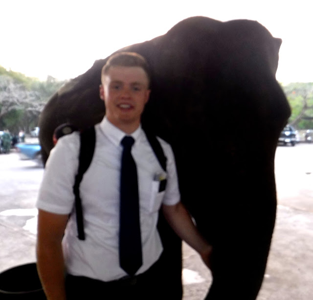 Elder Jesse Bundy taking a picture with a random elephant that was roaming loose at the bus station